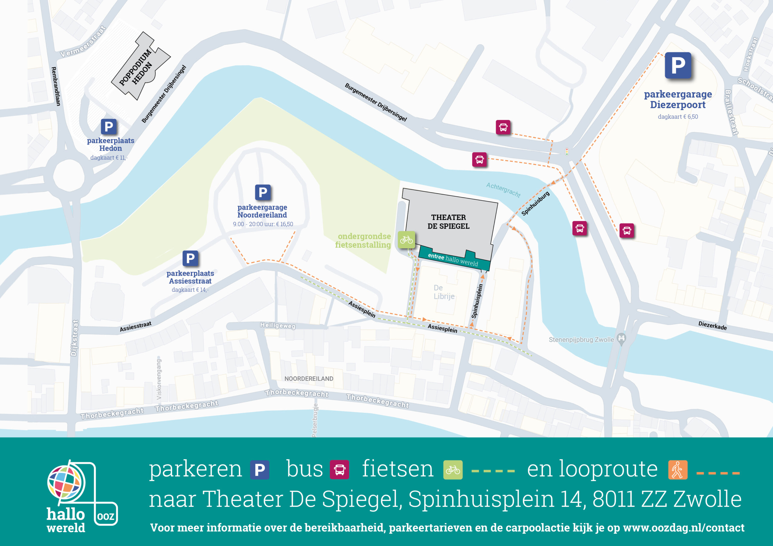 Kom je met de auto naar de OOZ-dag? Dan kan je de reiskosten middels een dienstreisvergoeding (kilometers) declareren via het EIC van HR2day. De kosten voor parkeren zijn, zoals normaal ook het geval is, bij de (kilometer)vergoeding inbegrepen. Gebruik voor parkeren parkeergarage Diezerpoort. Vanaf deze parkeergarage is Theater De Spiegel te bereiken via de loopbrug. Een dagkaart kost € 6,50. Let op: bij parkeergarage Noordereiland zijn de parkeerkosten een stuk hoger.
